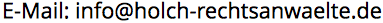 Die Berufsbezeichnung lautet: Rechtsanwältin/ Rechtsanwalt, verliehen in der Bundesrepublik Deutschland. Die nach dem Recht der Bundesrepublik Deutschland zugelassene Dr. Holch Rechtsanwaltsgesellschaft mbH unterliegt der Aufsicht der Rechtsanwaltskammer Schleswig-Holstein, Gottorfstraße 13, 24837 Schleswig, Tel: +49 46219391-0, Fax: +49 46219391-26, E-Mail: info@rak-sh.de, https://www.rak-sh.de. Die für die Gesellschaft tätigen, nach dem Recht der Bundesrepublik Deutschland zugelassenen Rechtsanwälte sind ebenfalls Mitglieder der Rechtsanwaltskammer Schleswig-Holstein und unterliegen deren Aufsicht.